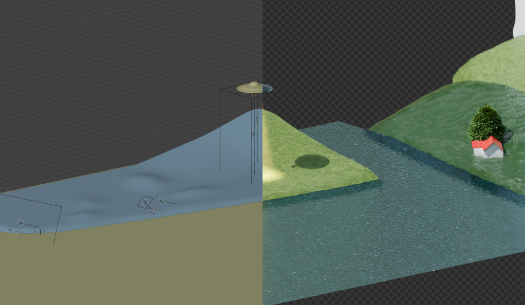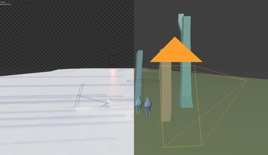 1.Illustratorで制作したイラストを基に、fspy(静止画からカメラパラメーターを解析するオープンソースアプリ)でカメラ位置を概算。2.<Blender作業> カメラパラメーターを読み込み、元イラストと比較しながら焦点距離などを調整。