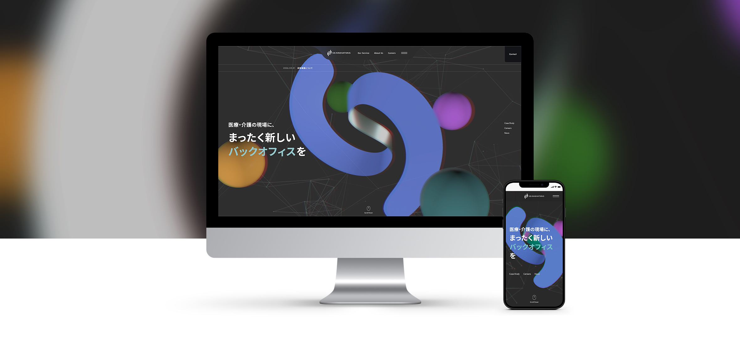 メインビジュアルのモーションビジュアルは、ロゴをモチーフとした3Dオブジェクトと空間をリアルタイムにレンダリングする高度な技術で表現。これにより、同業他社とは全く異なる方向性で業界内での独自性を伝えています。